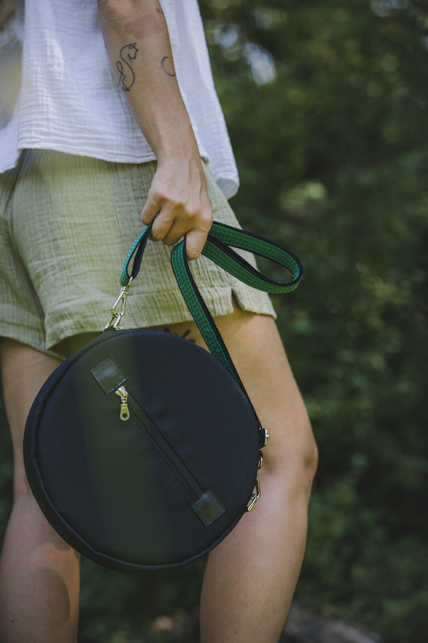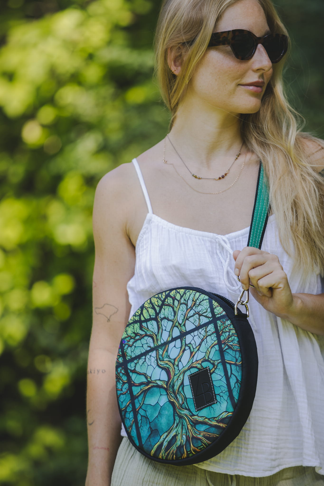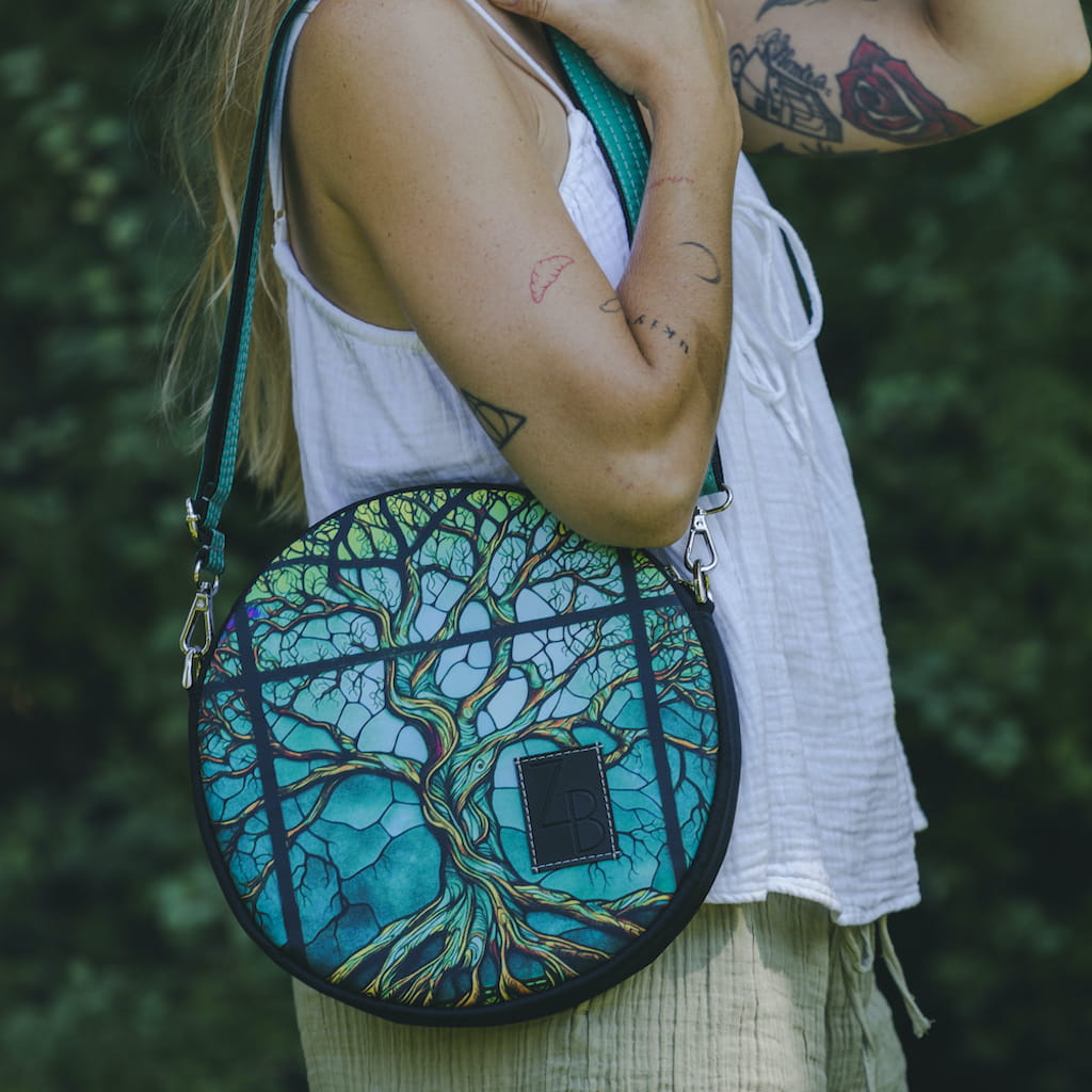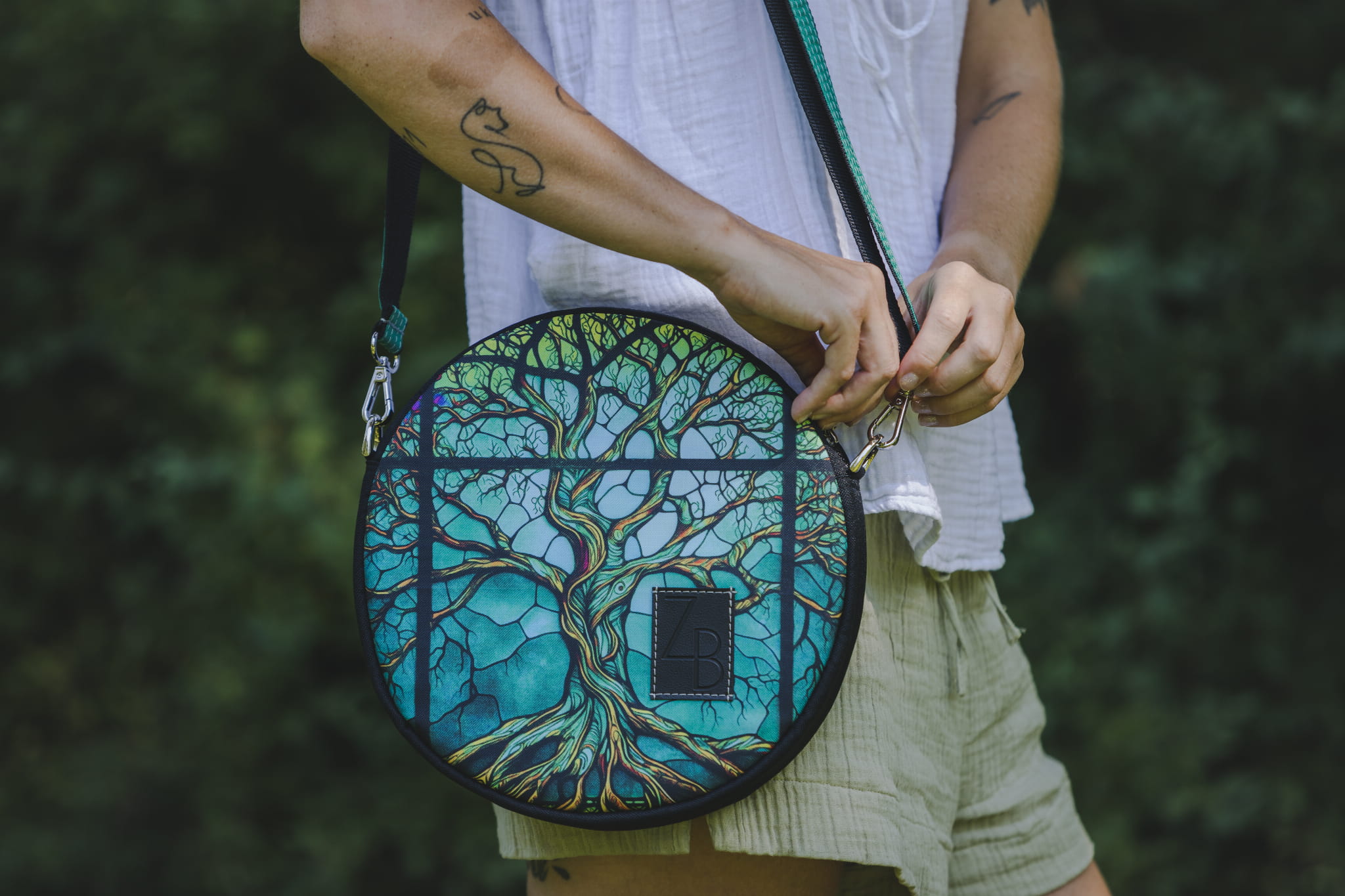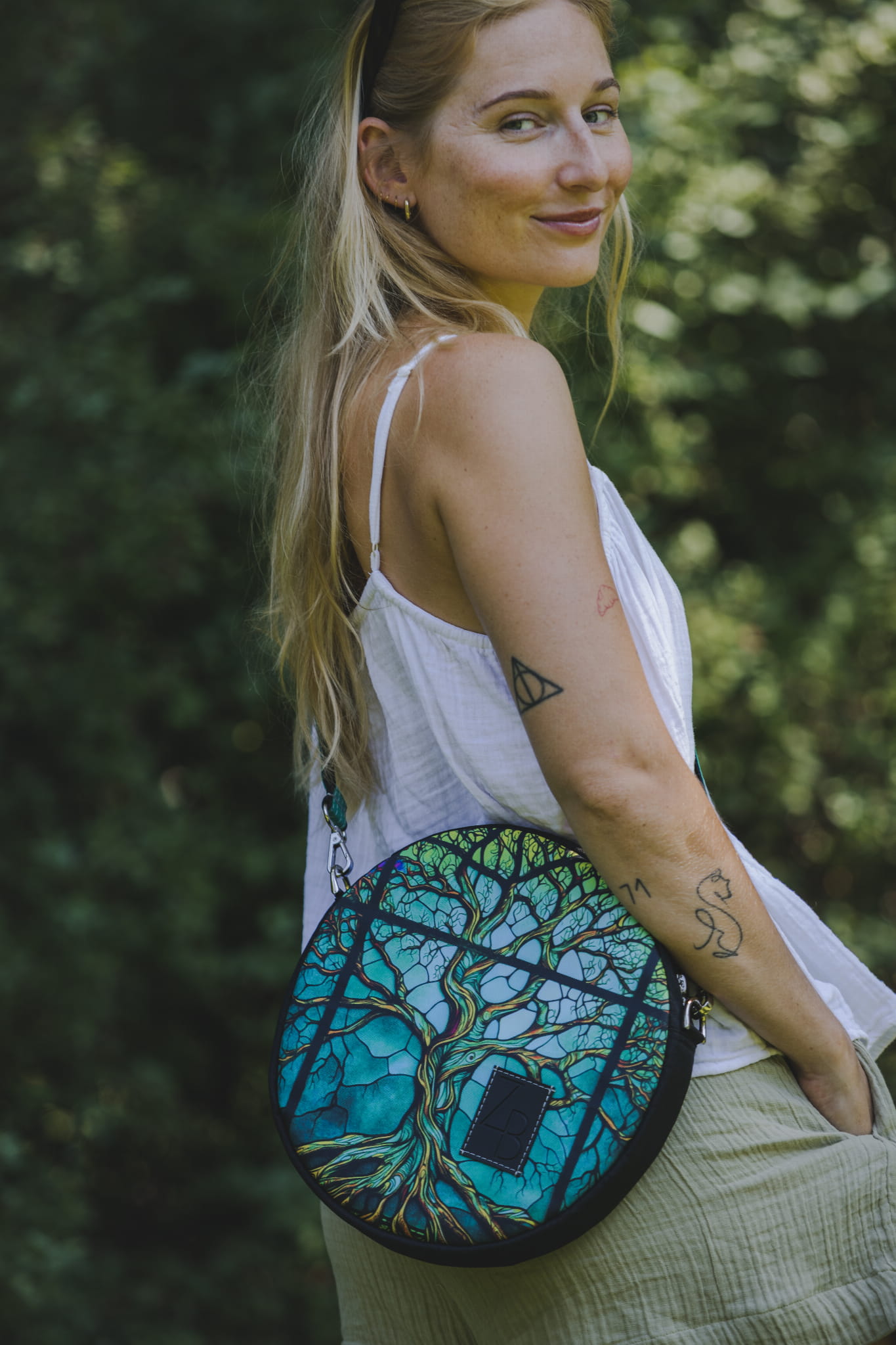 Miejska torba w kształcie koła, uszyta z trwałej, wodoodpornej tkaniny. Na froncie nadruk z wzorem drzewa, tył w kolorze czarnym.
