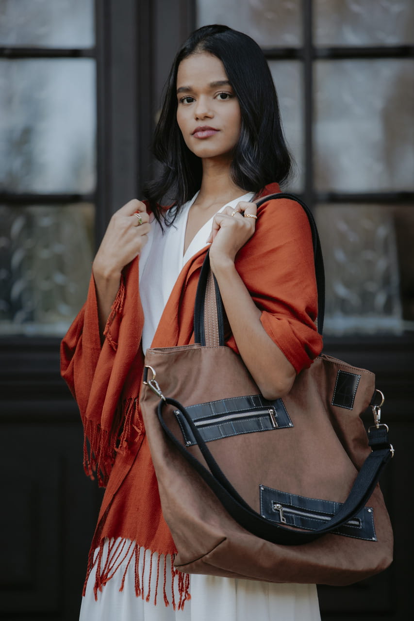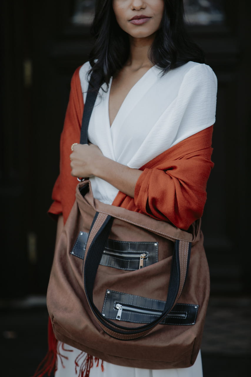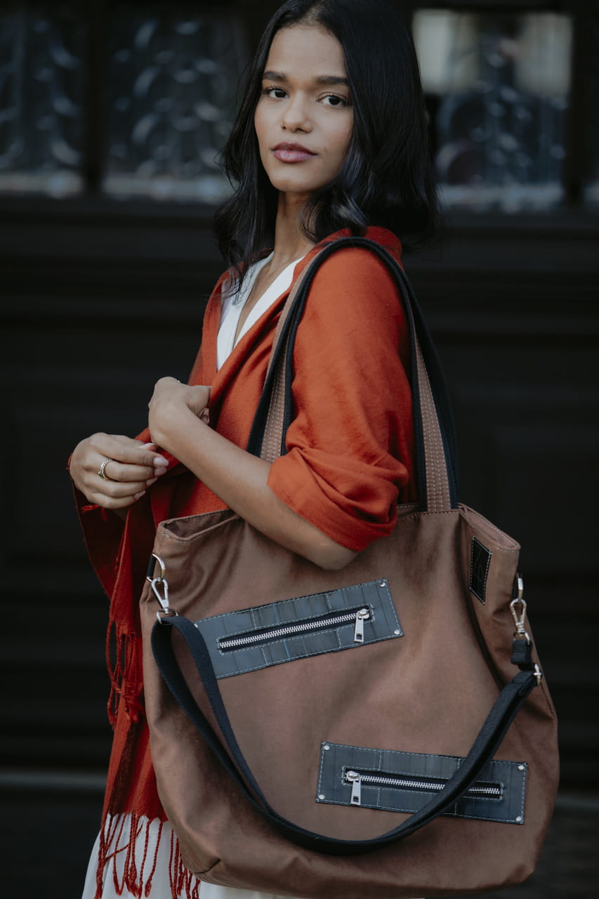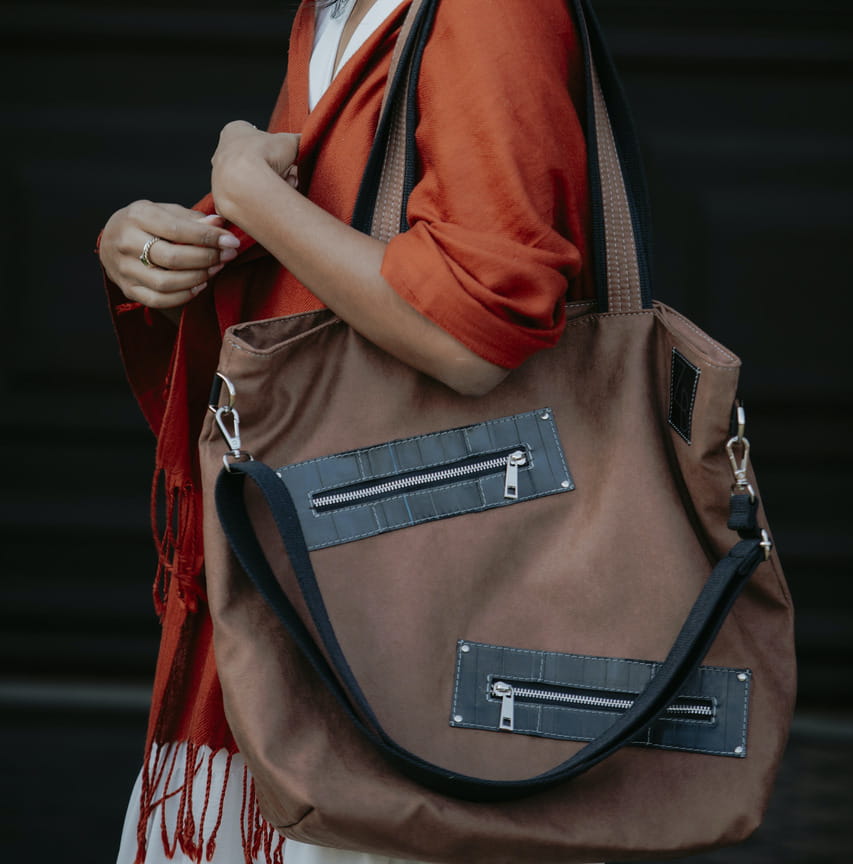 Pojemna, miejska torba, częściowo wykonana z dętek rowerowych.